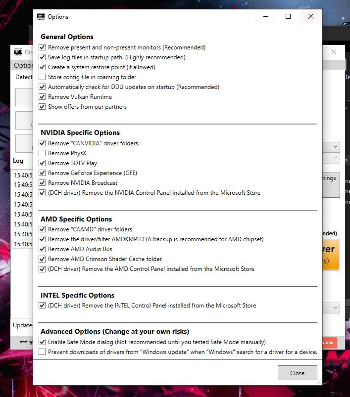 2. Open DDU and choose AMD in the drop down menu (open the options menu and make sure everything in the AMD section is ticked (including AMDKMPFD)).